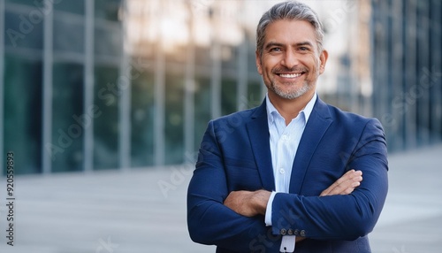 Happy middle aged business man entrepreneur looking at camera outdoors. Smiling confident man