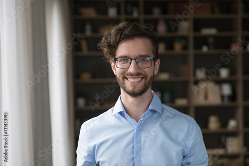 Happy millennial 30s bearded man in glasses smiling, look at camera. Head shot of guy wear eyeglasses standing in living room posing alone in cozy living room. Portrait of male tenant, new flat owner