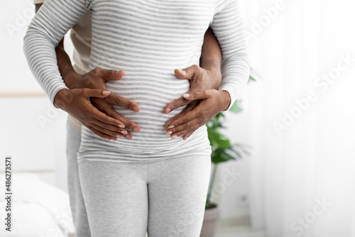 Happy millennial african american man hugs belly of pregnant woman in bedroom interior