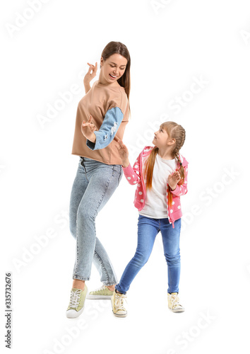 Happy mother and her little daughter dancing against white background