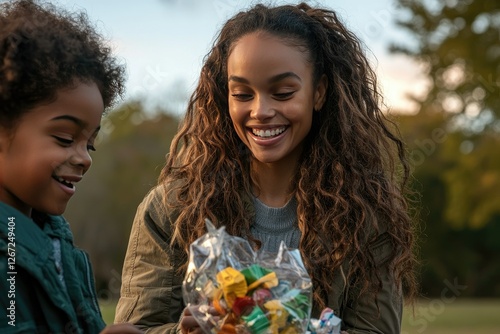 Happy Mother and Son Sharing Colorful Treats Outdoors