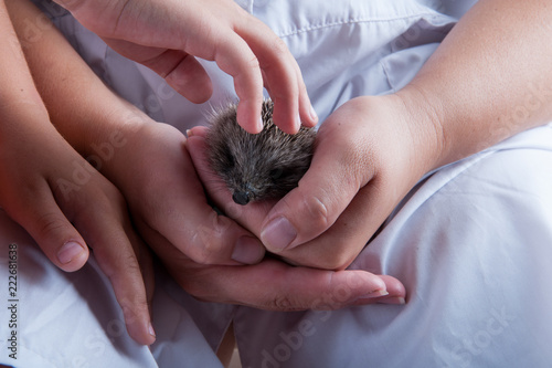happy mother girl examines young hedgehog and shows it to children. Hands with mammal. close-up. concept of healthy lifestyle in nature, the love of peace, respect for nature, motherhood in farm