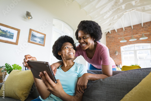 Happy mother looking at teenage daughter using digital tablet on sofa at home