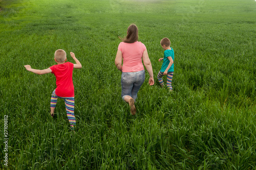 Happy mother with children playing on a green field with wheat..Unity with nature concept