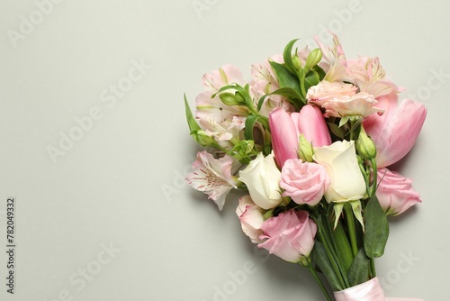 Happy Mother's Day. Bouquet of beautiful flowers on light grey background, top view. Space for text