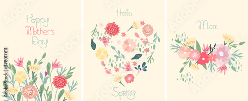 Happy Mother's Day greeting card with bright flowers, green leaves, hearts, etc. The concept of happiness, joy, holiday. Vector graphics.