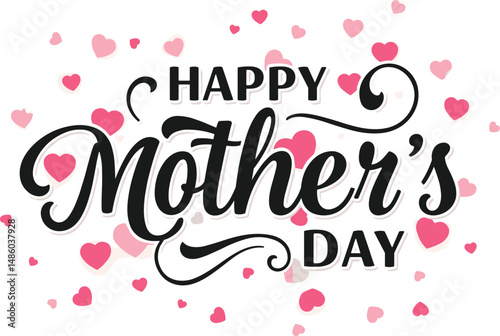 Happy Mother's Day typography vector with handwritten calligraphy and pink hearts – Elegant lettering design isolated on transparent background