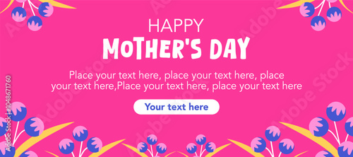 Happy Mothers Day, Womens Day and birthday card simple illustration with purple flowers, hand drawn floral art on pink background for horizontal posters, web banners, covers, and social media