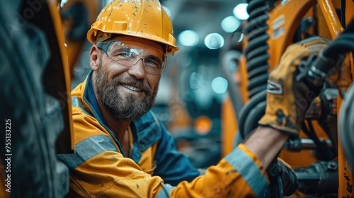 Happy motor vehicle mechatronics engineer repairing yellow telehandler. Generative AI.