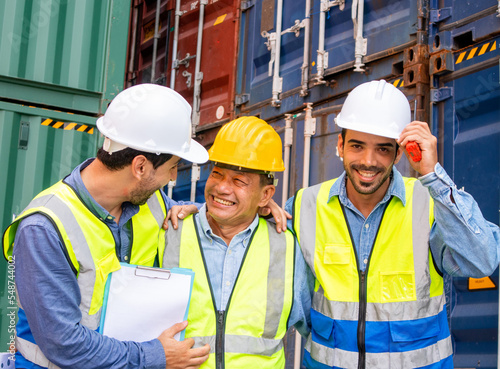 Happy multiethnic professional engineers teamwork smiling and laughing together. Worker team's achievements and happiness at work
