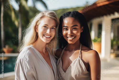 Happy multiethnic women together in a luxury retreat. Generative AI.