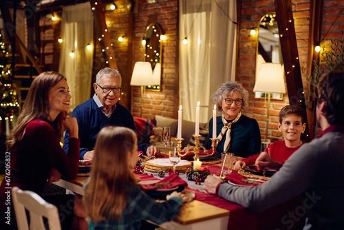 Happy multigeneration family talks during Christmas dinner at dining table.