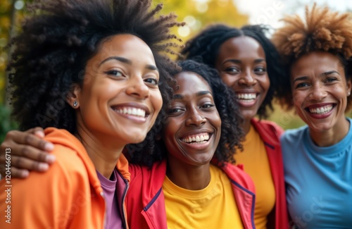 Happy multi-generational women embrace outdoor fitness. Group of diverse females smile happily after workout. Multiracial friends pose together in park. Enjoying friendship, supportive community.