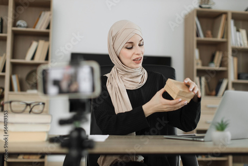 Happy muslim female blogger unpacking gift boxes presents from companies and doing live streaming. Arab woman using smart phone camera for creating content.