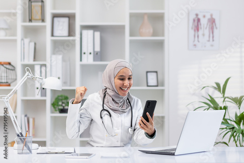 Happy Muslim female doctor in hijab celebrating success while looking at her smartphone in a modern clinic office.
