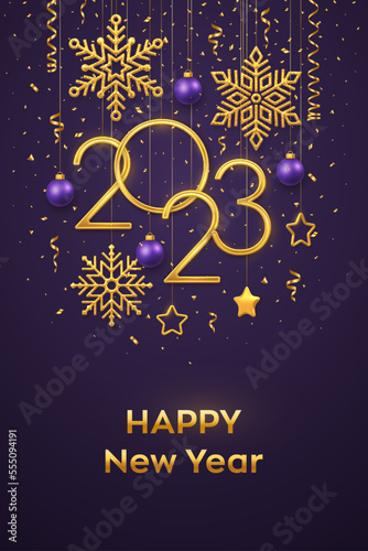 Happy New 2023 Year. Hanging Golden metallic numbers 2023 with shining snowflakes, 3D metallic stars, balls and confetti on purple background. New Year greeting card or banner template. Vector.