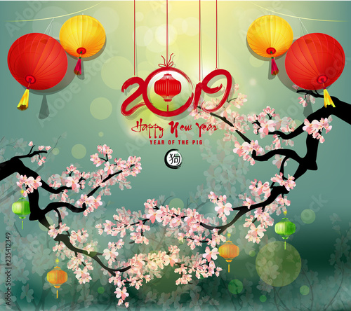 Happy New Year 2019. Chienese New Year, Year of the Pig. Cherry blossom background