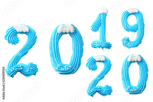 Happy New Year 2020. Number 2020 made of blue sweets. Creative typography, banner design. Sweet winter dessert ingredients