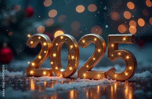 Happy New Year 2025 background, illustration for holiday design with lights and fireworks