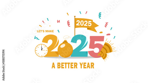 Happy new year 2025 typography greeting card, poster, banner with celebration elements. Happy new year walpaper.