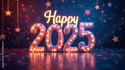 Happy New Year 2025 with glowing lights. Concept of celebration, holiday, and future.