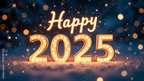 Happy New Year 2025 with glowing lights. Concept of celebration, holiday, and winter.