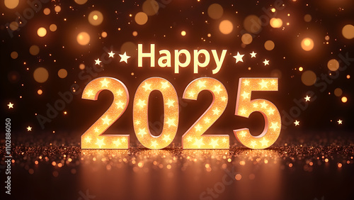 Happy New Year 2025 with golden lights. Festive celebration concept.