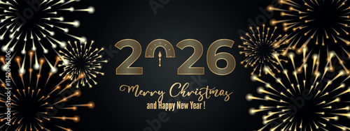Happy New Year 2026 Elegant gold text with balloons and confetti. Realistic vector illustration