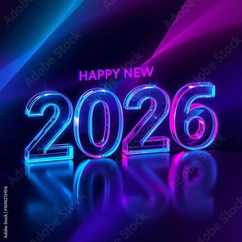 Happy new year 2026 greeting with glowing neon blue and pink numbers and reflections