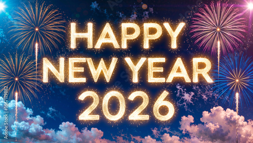 Happy new year 2026 sparkling text with fireworks and a night sky
