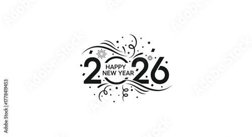 Happy new year 2026 text with abstract festive decorative elements and confetti