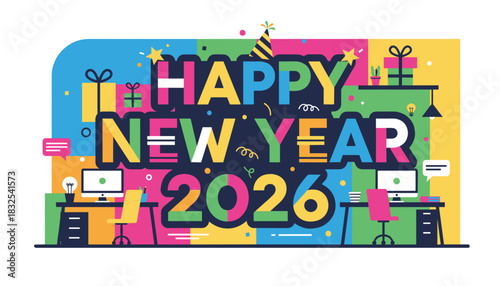 Happy New Year 2026 vibrant corporate greeting with creative office desks and festive elements