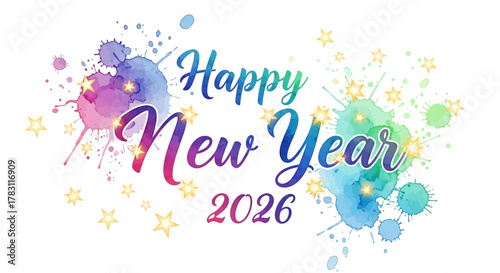Happy New Year 2026 watercolor design festive greeting with colorful splashes and stars isolated on white background
