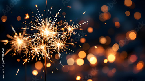 Happy New Year, Glittering burning sparkler against colorful fireworks background