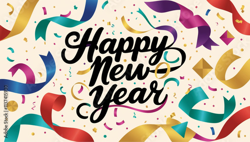 Happy New Year greeting card banner with colorful ribbons, falling confetti, and festive calligraphy typography on a light background.