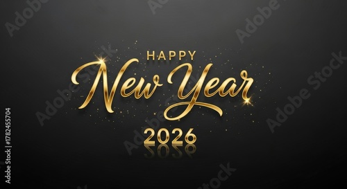Happy new year greeting card with golden text and sparkling details on a dark background for year 2026