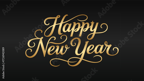 Happy New Year lettering presents gold script and elegant flourishes on a black background with celebration text