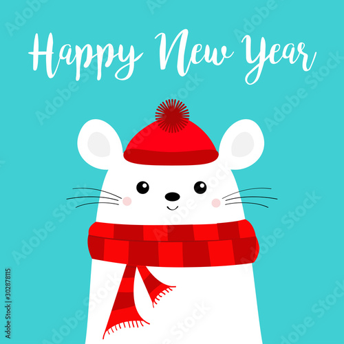 Happy New Year. White mouse head face. Red hat, scarf. 2020 sign symbol. Merry Christmas. Cute funny cartoon kawaii baby character. Flat design. Blue winter background.