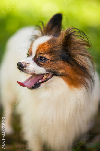 Happy Papillon Dog in the garden with flowers.