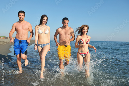happy people group have fun and running on beach