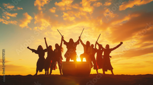 Happy pirates raising their swords behind a treasure chest at sunset, creating silhouettes