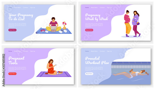 Happy pregnancy landing page vector template set. Maternity preparation website interface idea with flat illustrations. Expectation of baby homepage layout. Web banner, webpage cartoon concept