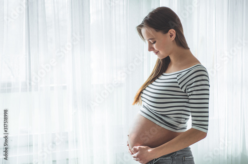 Happy pregnant woman with big belly by the window. Concepts of pregnancy and family