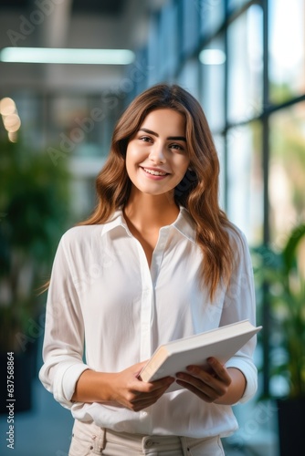 Happy pretty european girl student holding book standing in modern university campus library and study reading book. Generative AI