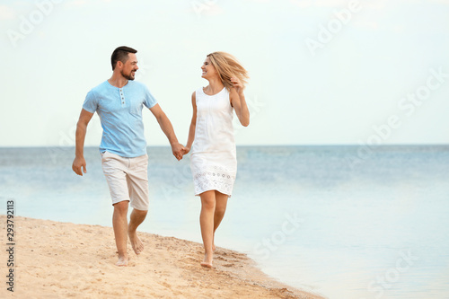 Happy romantic couple running together on beach, space for text