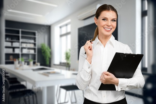 Happy saleswoman, welcoming client standing in office concept.