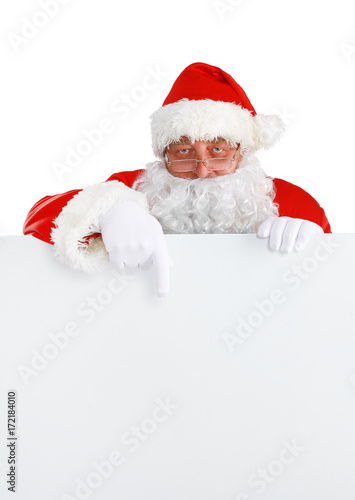 Happy Santa Claus looking out from behind the blank sign isolated on white background
