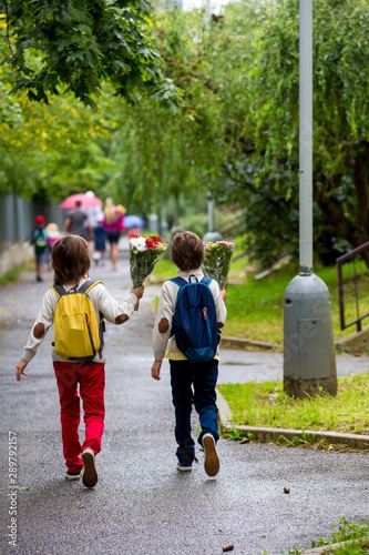 Happy school children, holding bouquet of flowers, going to school first day