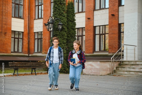Happy schoolchildren near the school. A boy and a girl are primary school students. School friendship