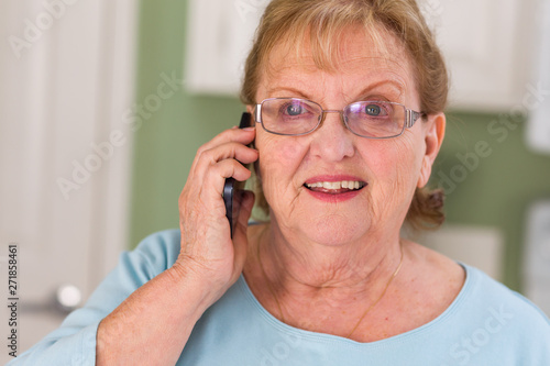 Happy Senior Adult Woman on Her Smart Cell Phone in Kitchen